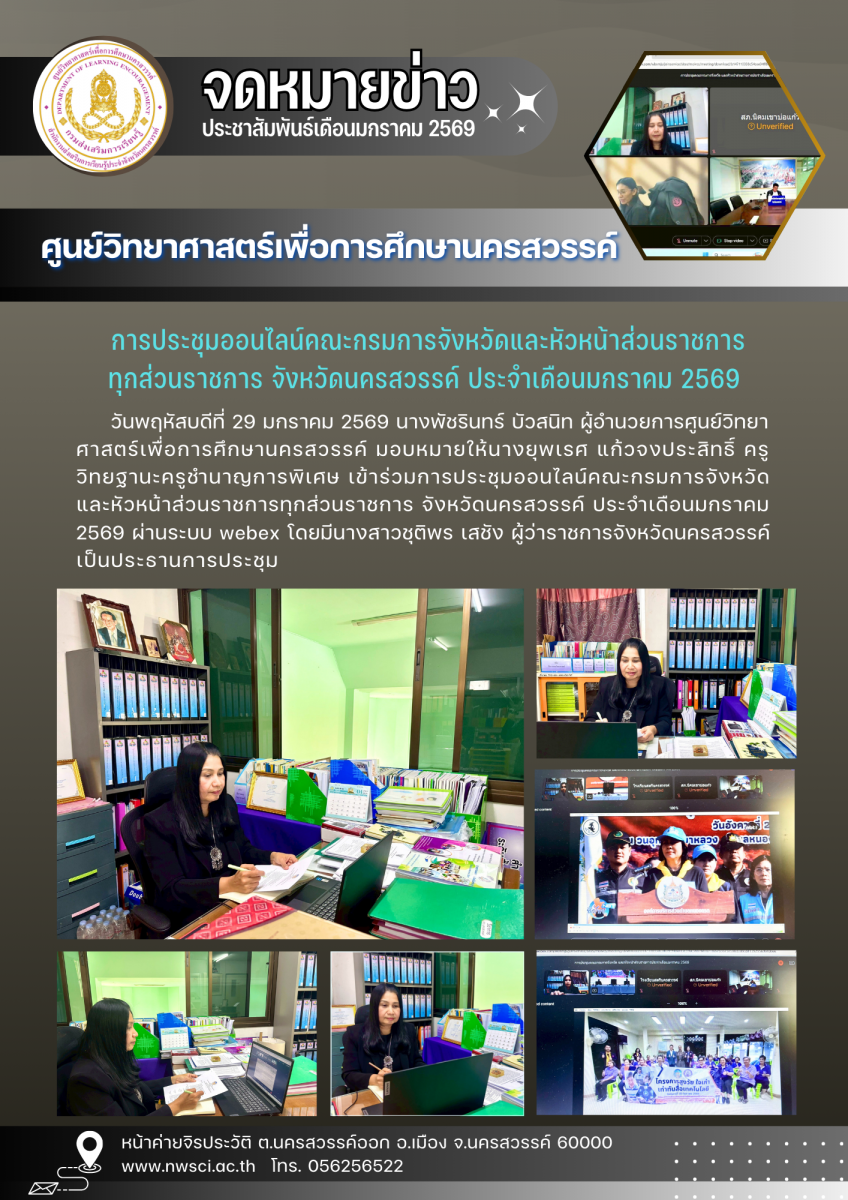 การประชุมออนไลน์คณะกรมการจังหวัดและหัวหน้าส่วนราชการ ทุกส่วนราชการ จังหวัดนครสวรรค์ ประจำเดือนมกราคม 2569 โพตส์เมื่อ : 2026-01-29 16:11:27 8 ครั้ง